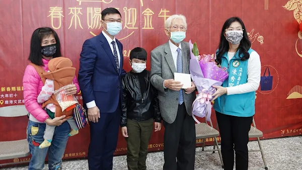 來自東石里的吳媽媽為中低收入戶,帶著10歲與1歲的幼兒獻花給「辜爺爺」,感謝他的善心義舉。吳媽媽說,家裡只靠先生一個人的收入有限,在過年前能夠領到辜老先生的5千元紅包,真的是有很大的幫助,非常感謝辜老的善心,感激不盡。
