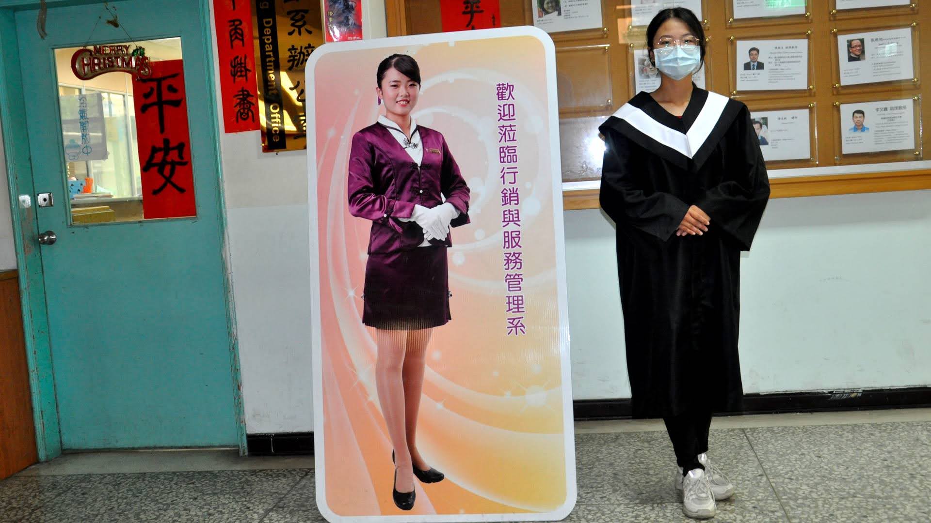 | 就讀行銷系的陳滎溱不但品學兼優還是親善服務團人形立牌。 |