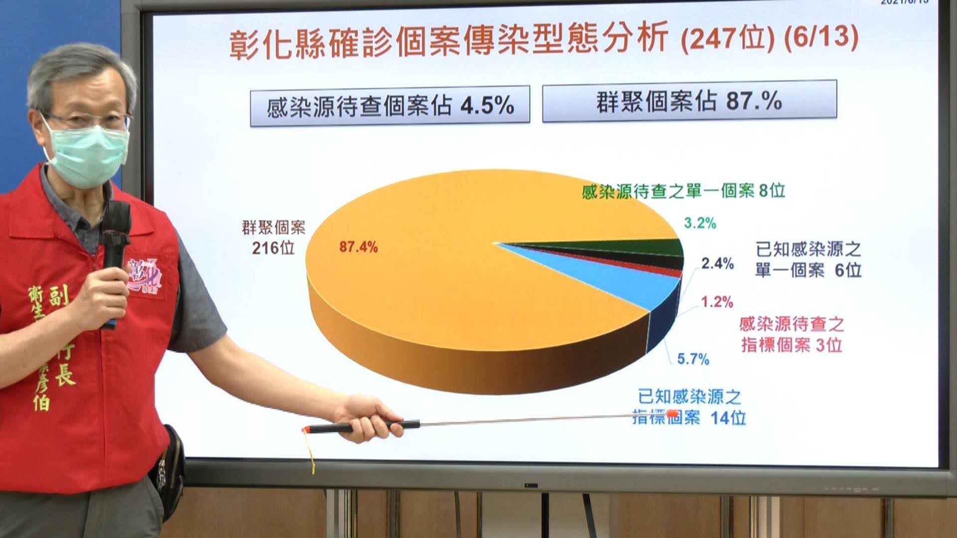 葉彥伯指出,從確診個案傳染型態分析來看,彰化縣累積確診人數247人,其中群聚個案就有216位佔87.4%,感染源待查之單一個案有8位,佔3.2%,已知感染源之單一個案6位2.4%,感染源待查之指標個案3位1.2%,已知感染源之指標個案14位5.7%,從確診個案傳染型態分析來看,提醒大家群聚感染的機會相當高佔87.4%,同時,不可知的隱形感染源仍佔有4.4%,提醒大家仍要小心防範。
