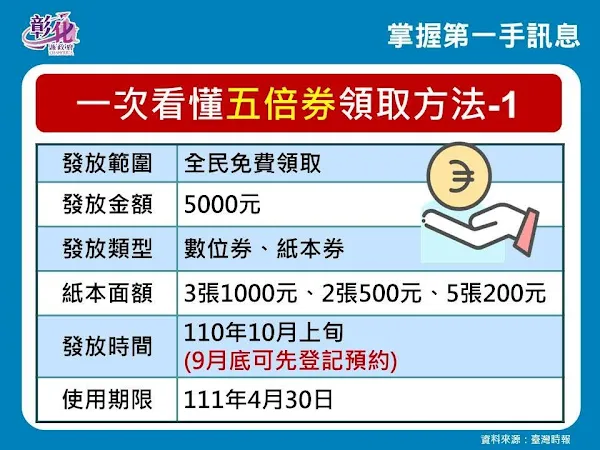 王惠美指出,9月底開始登記預約五倍券,10月上旬開始領用,使用期限到2022年4月30日,全民都可免費領取,每人可領5000元,分為紙本券及數位券,有3張1000元、2張500元、5張200元3種面額,欲使用紙本券的民眾可以到超商使用健保卡預定再到超商領取,或上中華郵政網頁預約,發放時在臨櫃領取;習慣使用數位券的民眾可以直接用智慧手機綁定信用卡、電子票證或電子支付APP,使用方式為全國實體店家、攤商、學雜費及部分指定電商等,不適用於網購、繳費、繳稅金、菸品、儲值、投資、買禮券等項目。