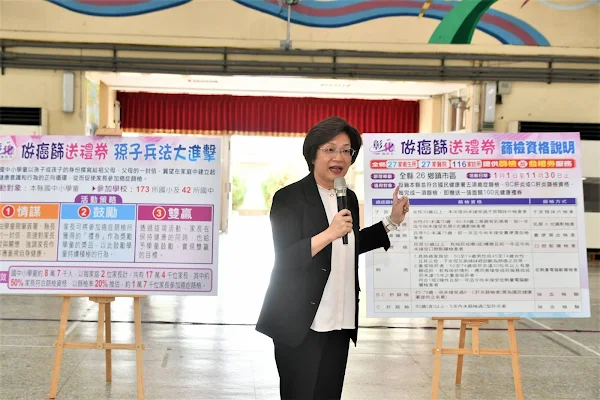 【記者林明佑/彰化市報導】彰化縣政府為鼓勵民眾癌症篩檢,今年持續辦理「做癌篩送禮券」活動,13日在彰化市平和國小活動中心辦理「做癌篩送禮券-孫子兵法大進擊」記者會,彰化縣長王惠美表示,為鼓勵長輩勇於健檢,今年更是規劃「孫子兵法大進擊」策略,希望透過兒孫的溫情,帶著阿公阿嬤跟爸爸媽媽一起來做健檢!